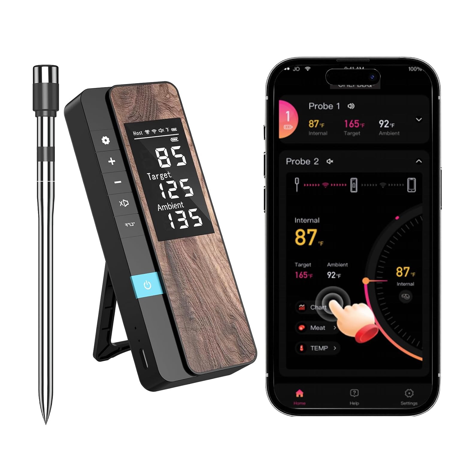 Smart APP & Real-Time Allerts: Download the CHEFBBQ App (iOS/Android) following system language of your phone and customizable recipes (no registration or WIFI required). Get real-time alerts when food reaches the perfect doneness, including when to take out and to how long to rest