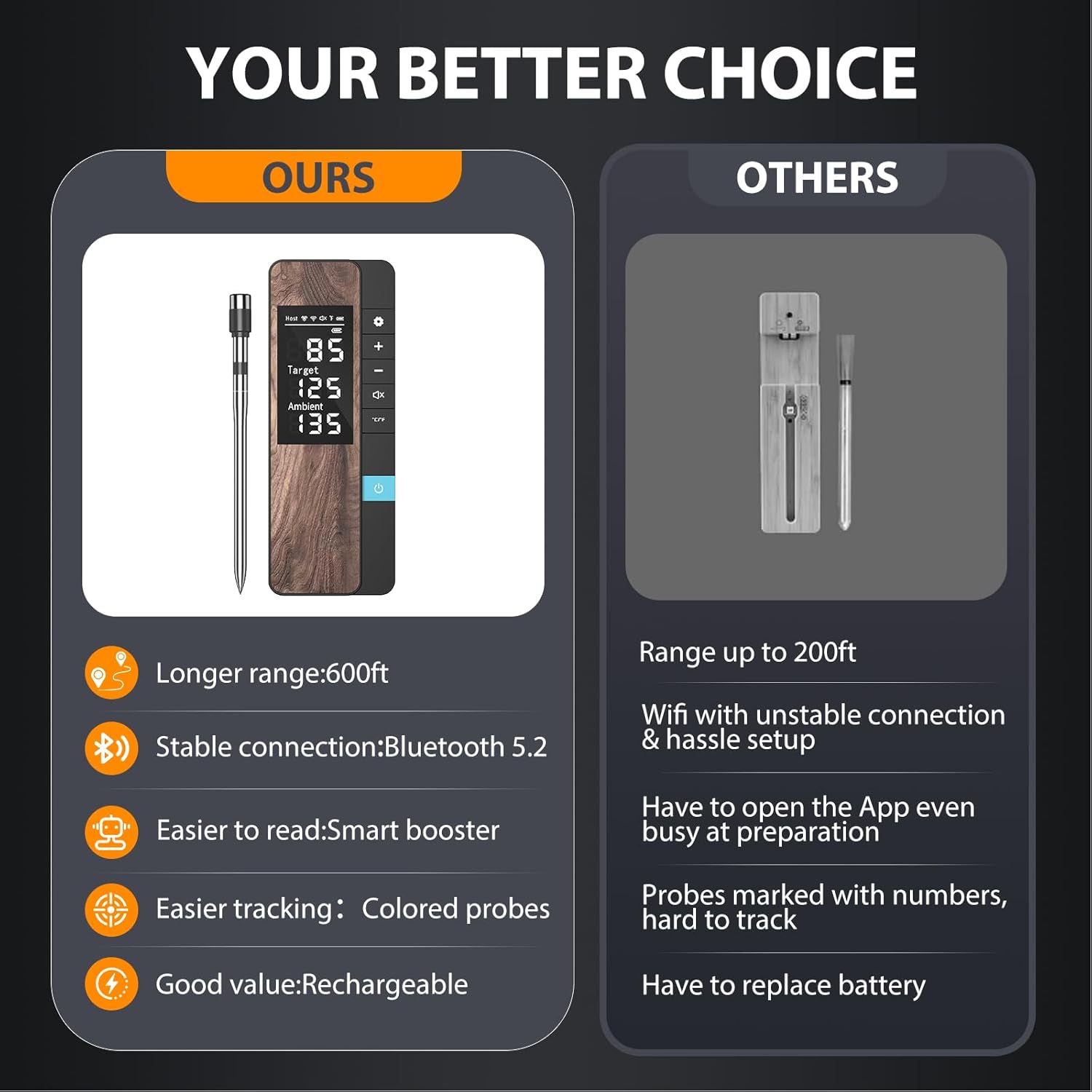 Durable, Heat-Resistant & Dishwasher Safe Probe Crafted: with premium stainless steel and a ceramic high-temperature resistant probe,this wireless cooking thermometer withstands the toughest conditions in smokers,grills,and ovens