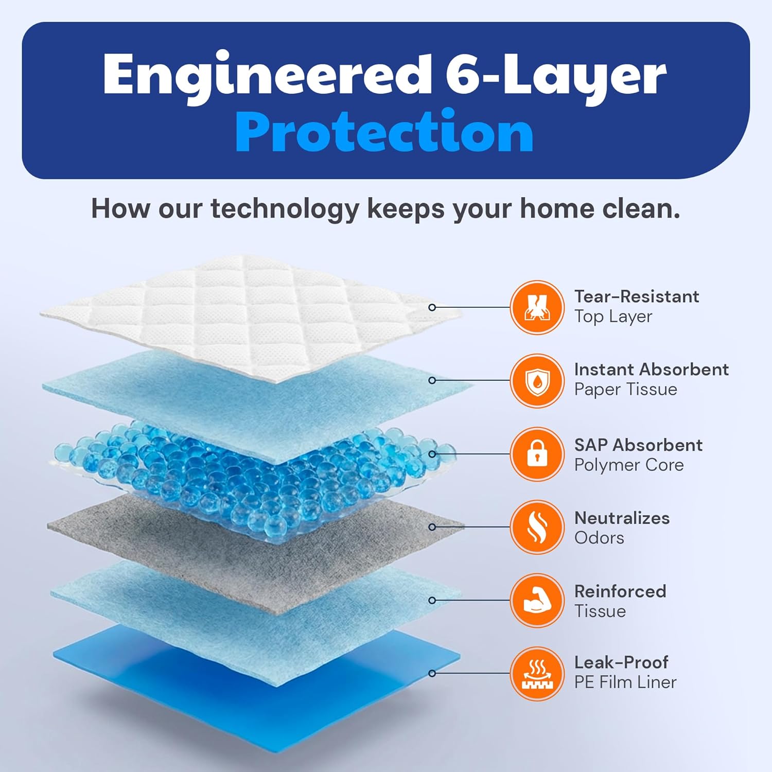6-LAYER PROTECTION: These training pads offer ultimate protection with 6 layers of premium material that work together seamlessly; from the quilted tear-resistant top sheet to the leak-proof backing, every layer is designed to work together to offer maximum absorption