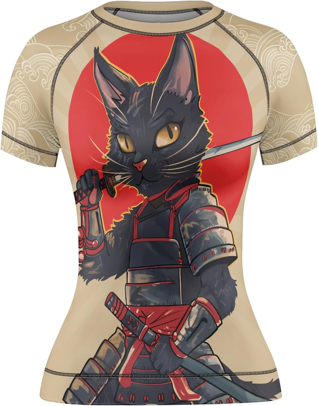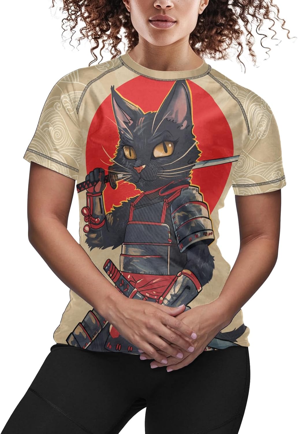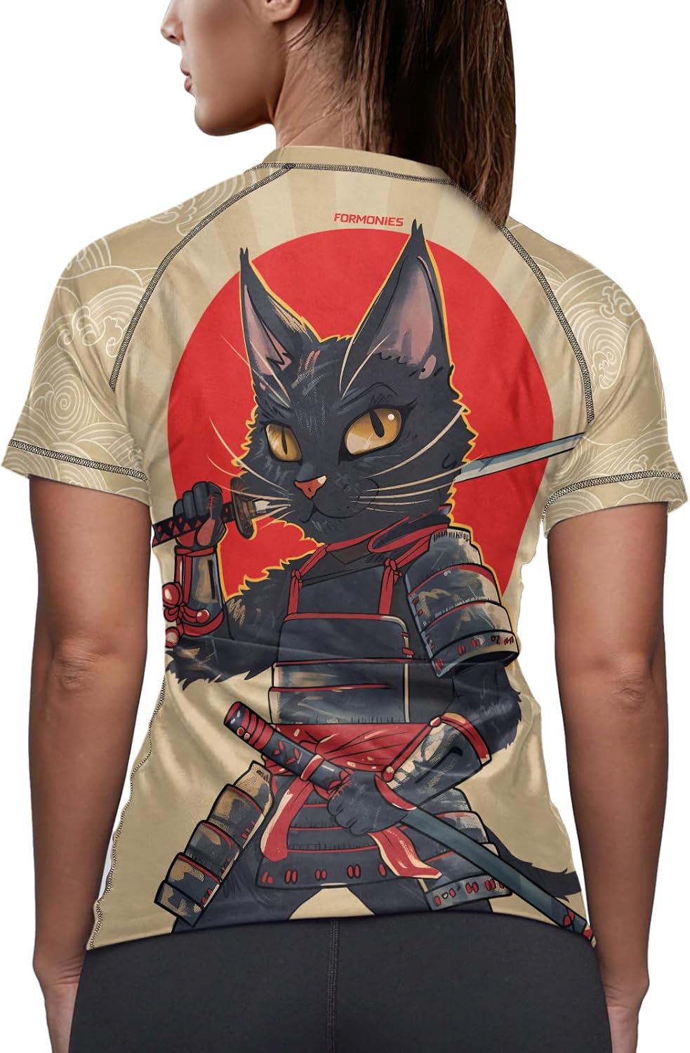 FORMONIES Samurai Pets Women’s Rash Guard Short Sleeve – Base Layer Compression Shirt for BJJ MMA No-Gi & Jiu Jitsu