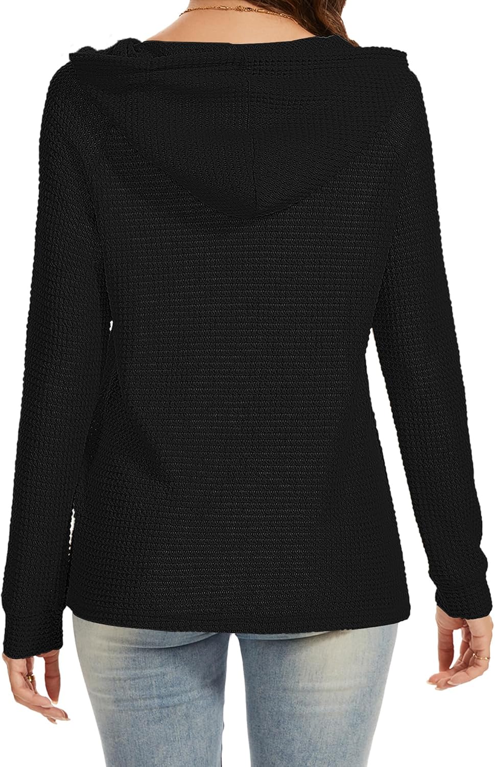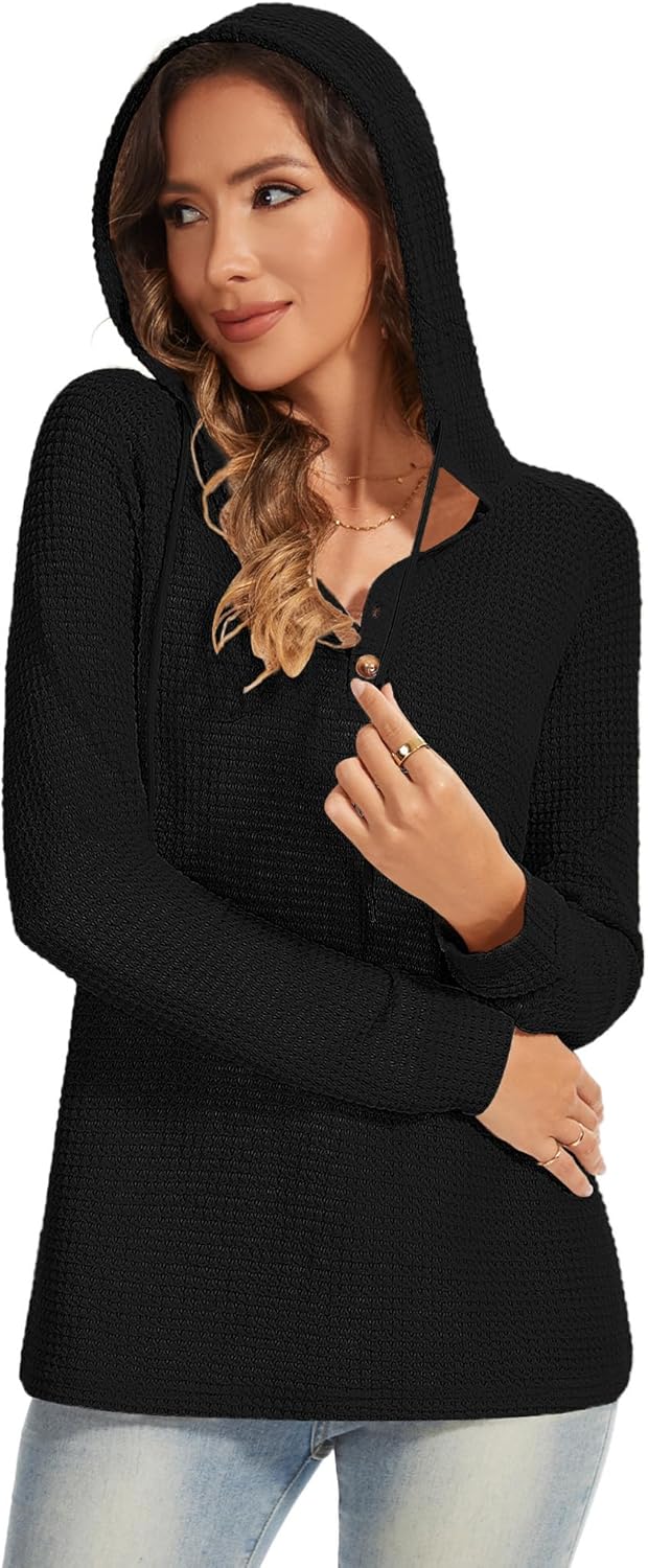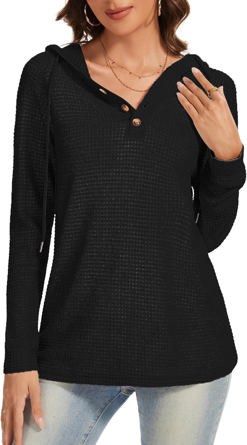 Womens Fall Hoodies Sweater V Neck Button Sweaters Long Sleeve Drawstring Hooded