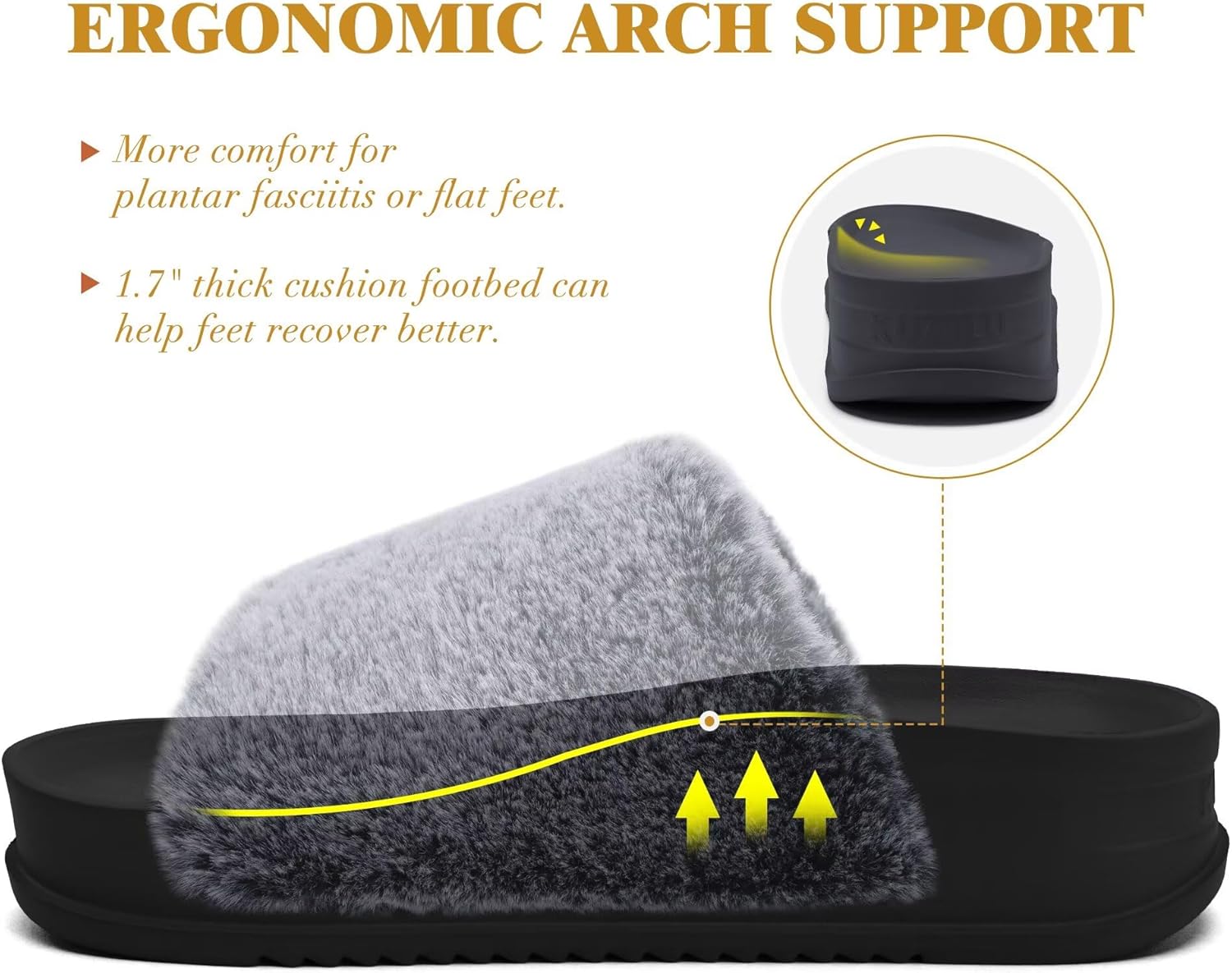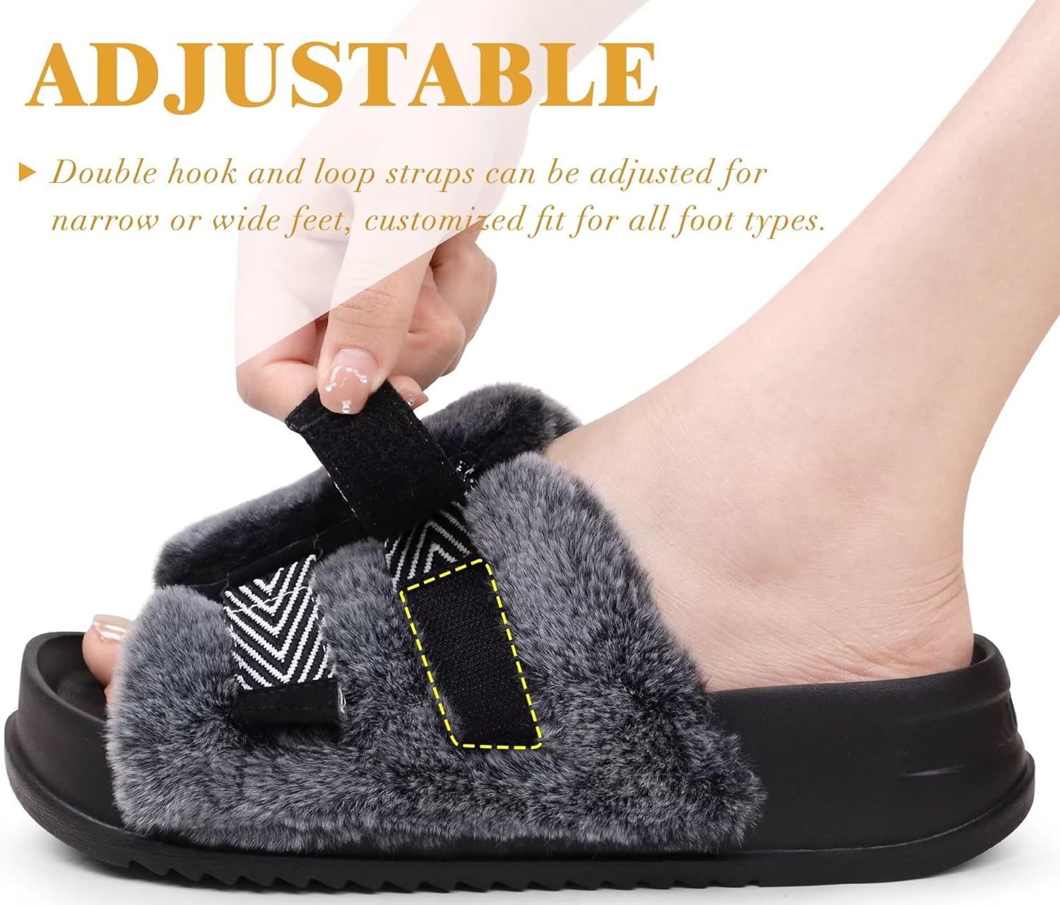 KuaiLu all-day comfort cushioning platform slippers are made from premium faux fur lined with soft and supportive EVA foam. Luxurious plush touch keeps you as warm as sitting by the fireplace in winter. Women’s open toe slippers allow toes to breathe freely, keep them dry and give feet a comfortable environment. Adjustable design, also suitable for people with wide feet and high instep. Ergonomic footbed and non-skid indoor/outdoor rubber bottom are perfect no matter at home or go out for a walk. Fashionable color matching design is loved by ladies of all ages and perfect as a thoughtful gift for your loved ones on Birthdays, upcoming Thanksgiving Day, Christmas, New Year, Valentine’s Day and Anniversaries.