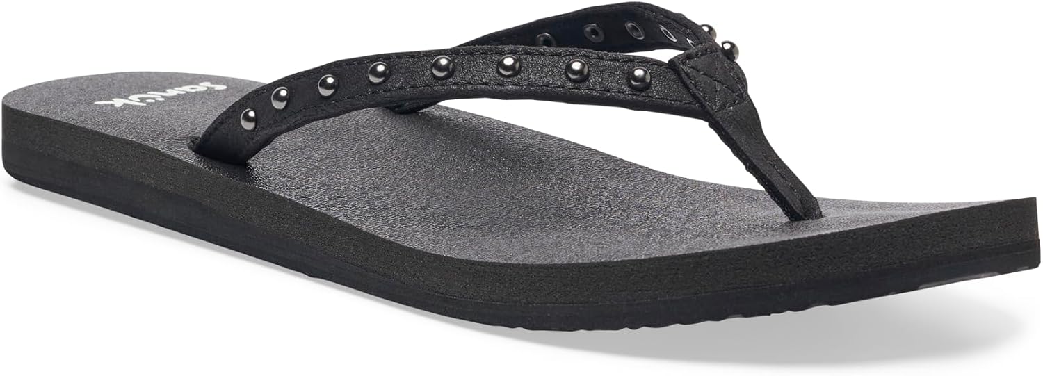 Brand new style. Synthetic leather upper strap with studs. Jersey lining made with GRS certified recycled polyester. The original memory foam Yoga Mat footbed that molds to your foot for instantly Om-azing comfort. Custom Happy U wave tread sponge rubber outsole made with 53% recycled material